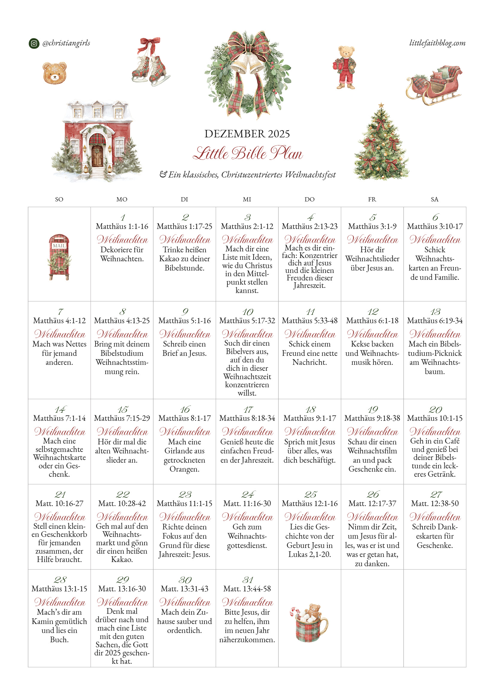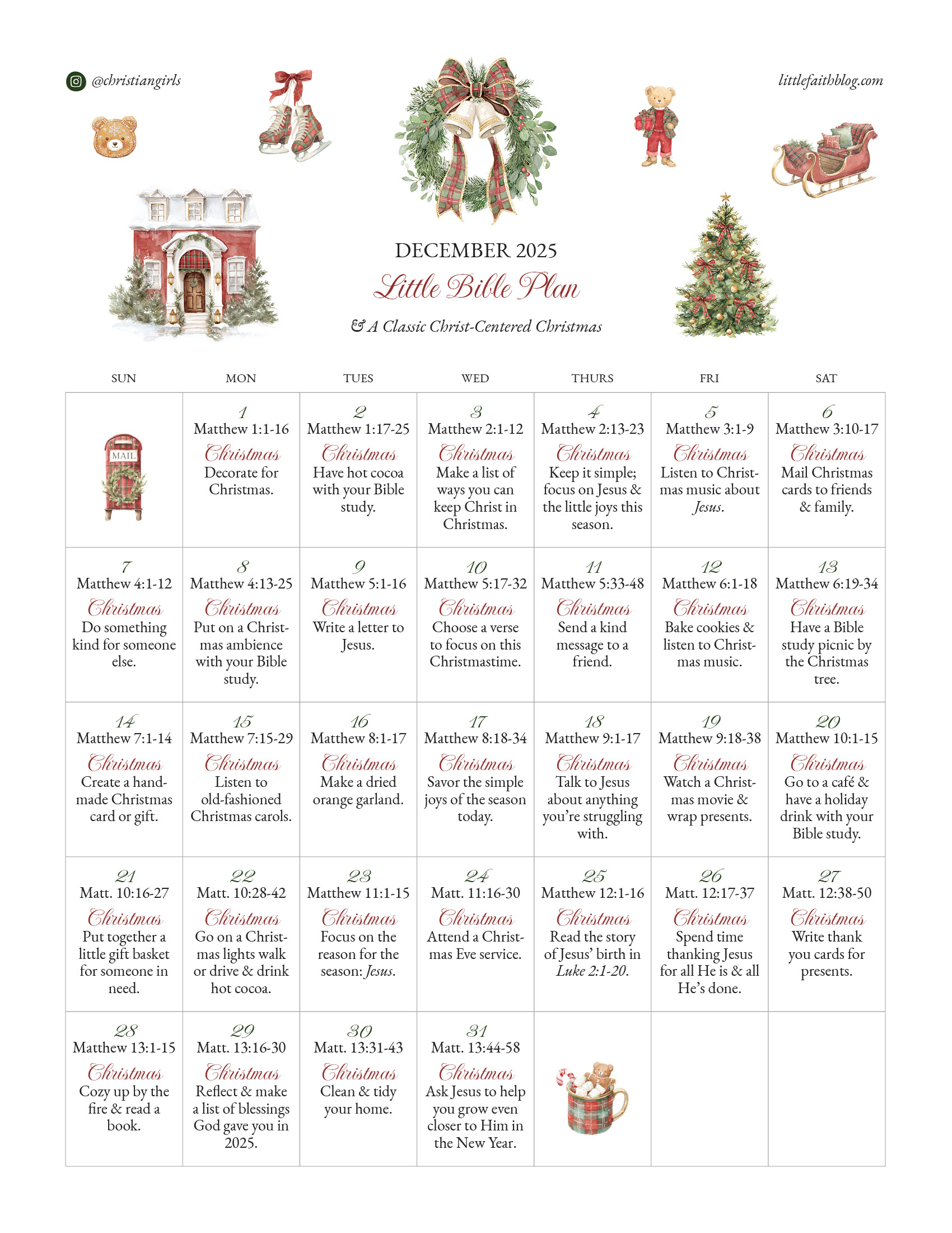 Another year of the Little Bible Plan comes to an end! I can’t believe it! Thank you so much for being here, whether this is your first time or you’ve been here for years. I am truly so grateful for this little ministry God has given me, and I hope to continue it for years to come, Lord willing. Wishing you a merry CHRISTmas! See you in the New Year!